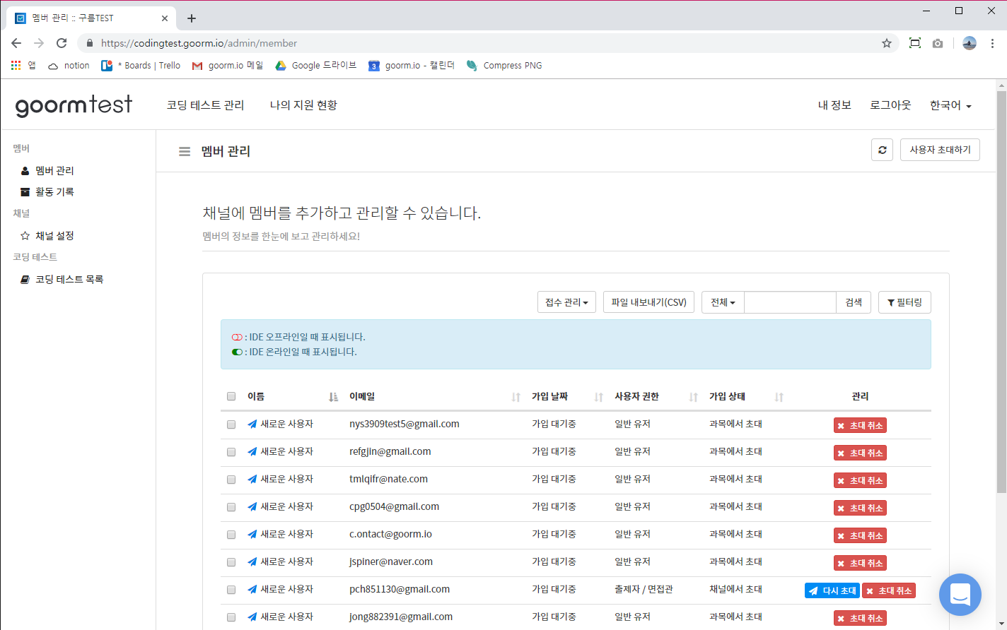공동 출제자 추가는 출제자 권한이 있는 대상만 추가할 수 있습니다. 관리자페이지(http://goormtest.goorm.io/admin/member)에서 출제자분들을 출제자권한으로 채널에 초대합니다. (참고로 출제자분들은 구름서비스 가입이 필요합니다.)