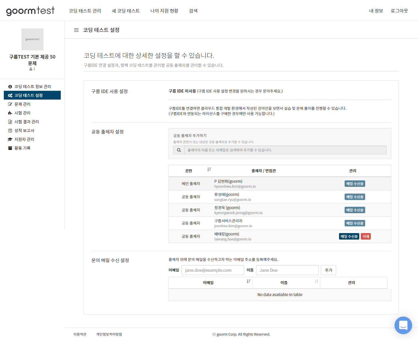 좌측 '코딩 테스트 설정'에서 코딩 테스트에 대한 상세한 설정을 할 수 있습니다. 구름IDE 연결 설정과, 함께 코딩 테스트를 관리할 공동 출제자를 관리할 수 있습니다.